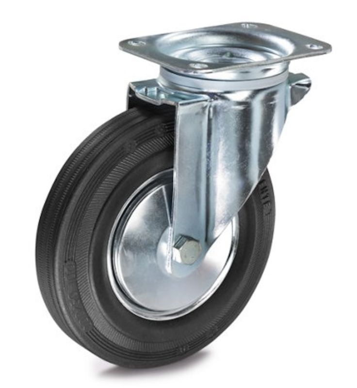 Gummihjul med stålfælg, hjul øxbredde 160x40 mm, drejehjul. På stålfælg Til let og middelstor belastning Temperaturbestandigt fra –5 °C til +60 °C. Hus af galvaniseret-kromateret stålplade. Drejeleje med dobbelt kuglekrans, drejelejebeskyttelse. Fælge af stålplade. glansgalvaniseret. Rullelejer.