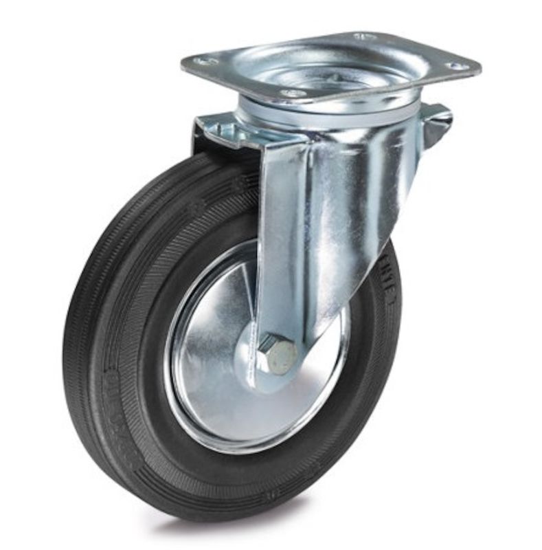 Gummihjul med stålfælg, hjul øxbredde 200x50 mm, drejehjul. På stålfælg Til let og middelstor belastning Temperaturbestandigt fra –5 °C til +60 °C. Hus af galvaniseret-kromateret stålplade. Drejeleje med dobbelt kuglekrans, drejelejebeskyttelse. Fælge af stålplade. glansgalvaniseret. Rullelejer.