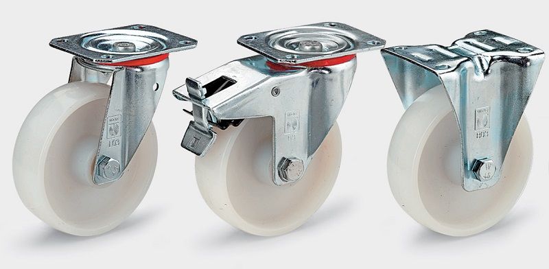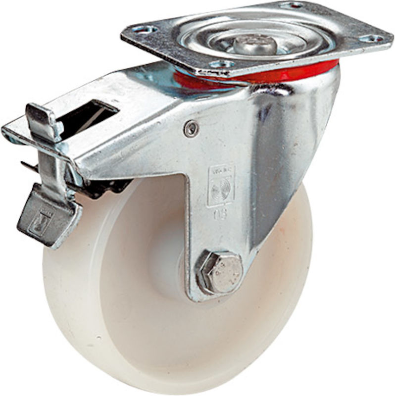 Polyamidhjul, drejehjul med dobbeltbremse, hjul Øxbredde 150x40 mm, drejeligt hjul med dobbeltbremse, rulleleje. Vedligeholdelsesfrit, let løb Slidstærkt I vidt omfang modstandsdygtigt mod mange typer af fortyndet syre og lud Temperaturbestandigt fra –20 °C til +80 °C. drejehjul med dobbeltbremse, galvaniseret-kromateret. Drejeleje med dobbelt kuglekrans, drejelejebeskyttelse.