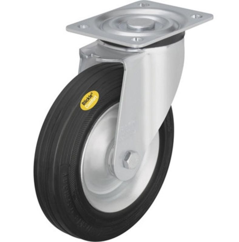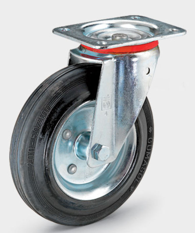 Transporthjul med stålfælg, hjul øxbredde 250x60 mm, drejelige hjul. På stålfælg. Høj slidstyrke. Forbedret igangsætningsmodstand. Temperaturbestandig fra -5 °C til +80 °C. Hus af galvaniseret-kromateret stålplade, drejeleje med dobbelt kuglekrans, drejelejebeskyttelse, fælge af stålplade. glansgalvaniserede. Rulleleje. Tidligere varenummer: 191604