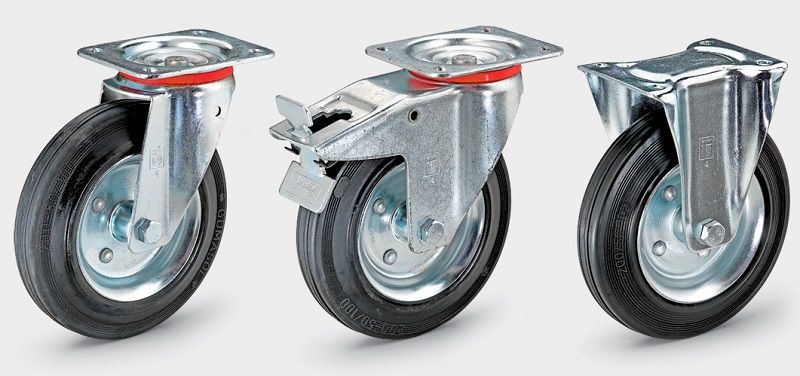 Transporthjul med stålfælg, hjul Øxbredde 180x50 mm, drejelige hjul med dobbeltbremse. På stålfælg. Høj slidstyrke. Forbedret igangsætningsmodstand. Temperaturbestandig fra -5 °C til +80 °C. Hus af galvaniseret-kromateret stålplade, drejeleje med dobbelt kuglekrans, drejelejebeskyttelse, fælge af stålplade. glansgalvaniserede. Rulleleje.