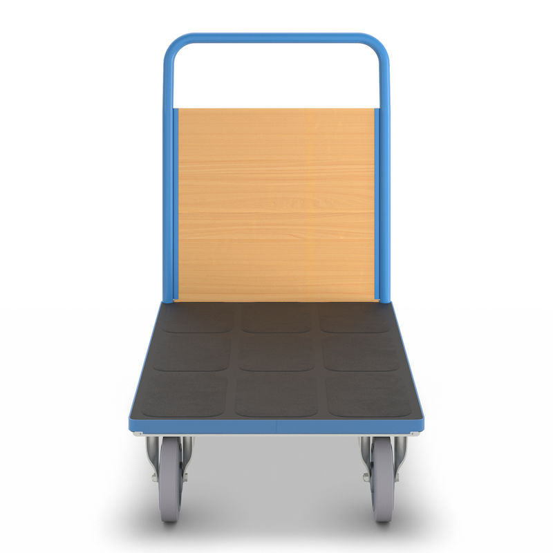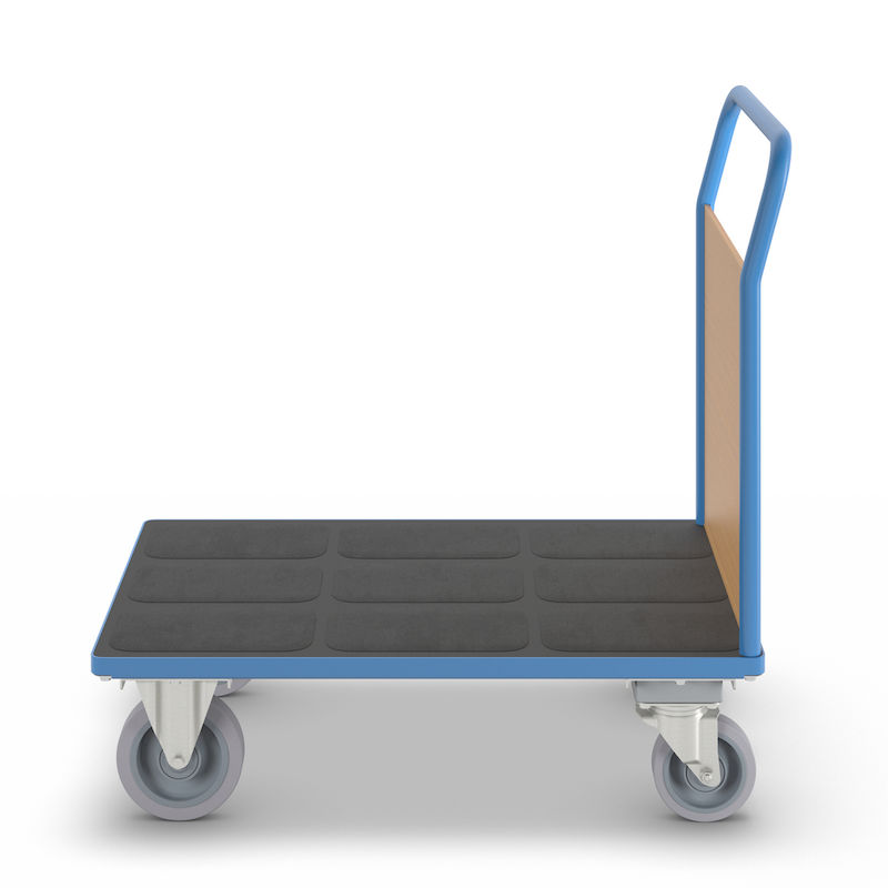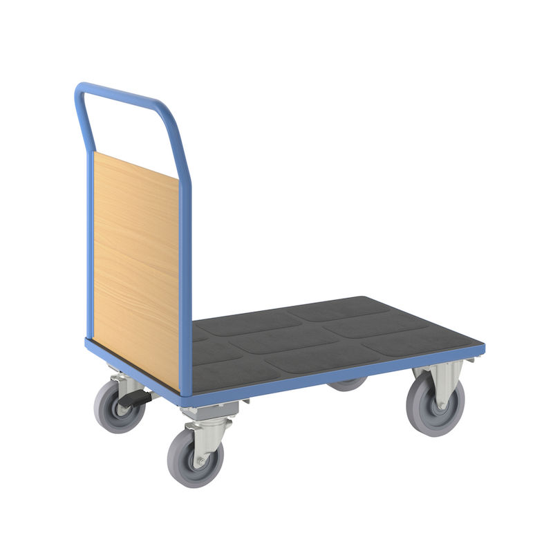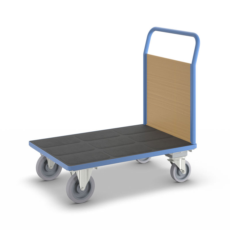 Platformsvogn Line, med 1 kortside, med centralbremse, LxB 1100 x 700 mm. Platformsvognen med trævægge udgør en praktisk og alsidig transportløsning, mens for- og bagpladen virker understøttende for lastsikringen. Den svejsede og pulverlakerede stålkonstruktion sikrer stabiliteten og giver vognen en lang levetid. Individuelt aftagelige sidevægge af MDF, der er belagt med dekormateriale gør vognen fleksibel at bruge. Med en læssehøjde på 280 mm og et robust lastareal af genanvendt plast kan vognen nemt transportere tung last. Lastarealets vejrbestandige, skridhæmmende og slidstærke overflade er ligeledes olie- og i vist omfang syreresistent. Uanset om vognen skal anvendes på lagre, værksteder eller i industrien, så kombinerer den effektivitet, sikkerhed og bæredygtighed og letter den daglige varetransport. Den høje kant hele vejen rundt beskytter godset.