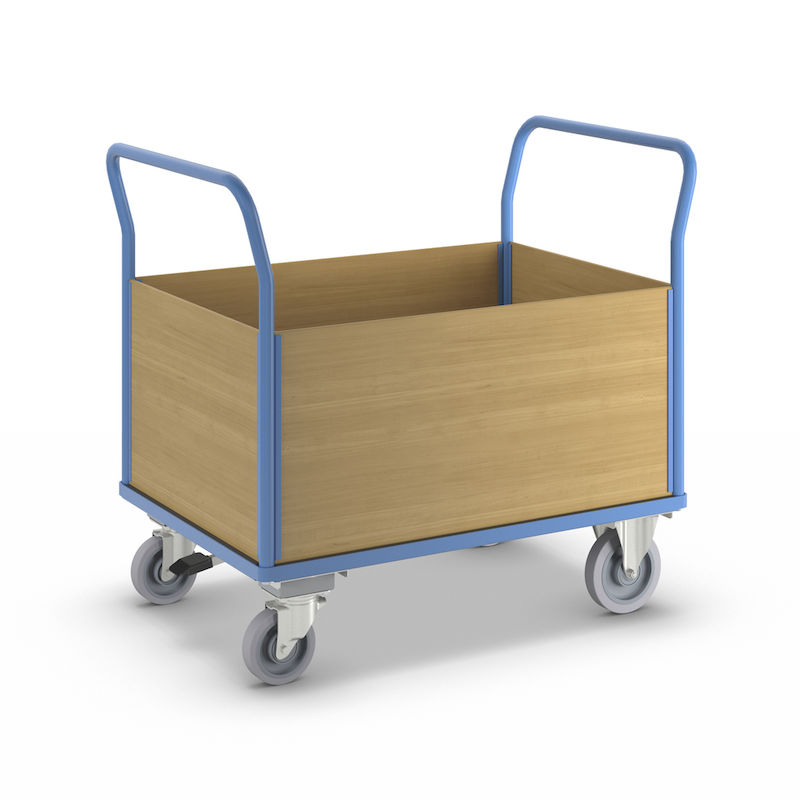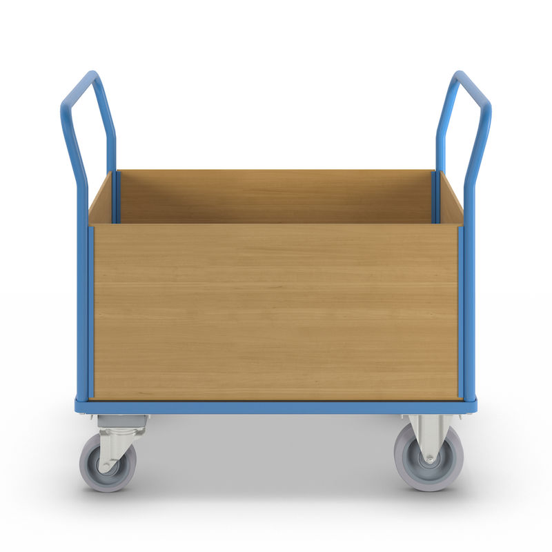 Platformsvogn Line, med 4 høje sider, centralbremse, LxB 1300 x 800 mm, helelastisk. Platformsvognen med trævægge udgør en praktisk og alsidig transportløsning, mens for- og bagpladen virker understøttende for lastsikringen. Den svejsede og pulverlakerede stålkonstruktion sikrer stabiliteten og giver vognen en lang levetid. Individuelt aftagelige sidevægge af MDF, der er belagt med dekormateriale gør vognen fleksibel at bruge. Med en læssehøjde på 280 mm og et robust lastareal af genanvendt plast kan vognen nemt transportere tung last. Lastarealets vejrbestandige, skridhæmmende og slidstærke overflade er ligeledes olie- og i vist omfang syreresistent. Uanset om vognen skal anvendes på lagre, værksteder eller i industrien, så kombinerer den effektivitet, sikkerhed og bæredygtighed og letter den daglige varetransport. Den høje kant hele vejen rundt beskytter godset.