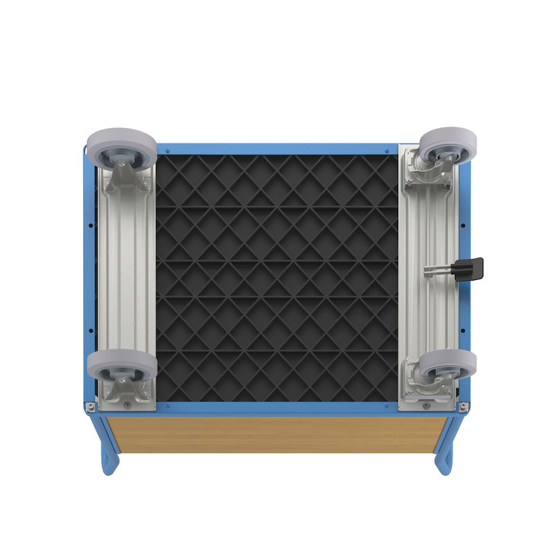 - Hjul: 2 drejelige hjul med centralbremser, 2 faste hjul
