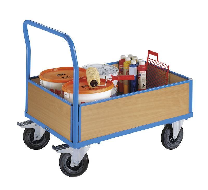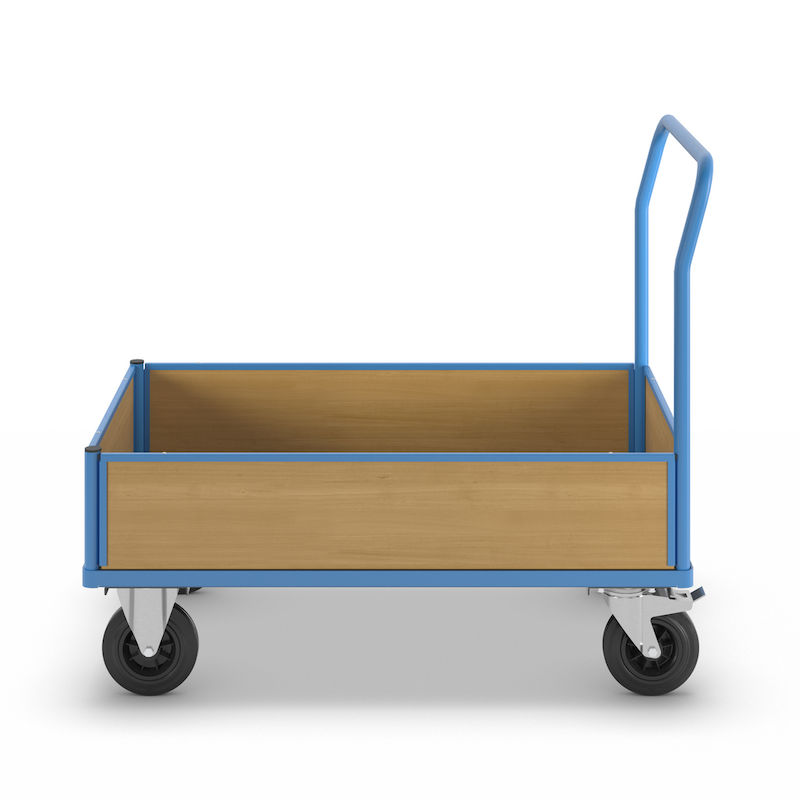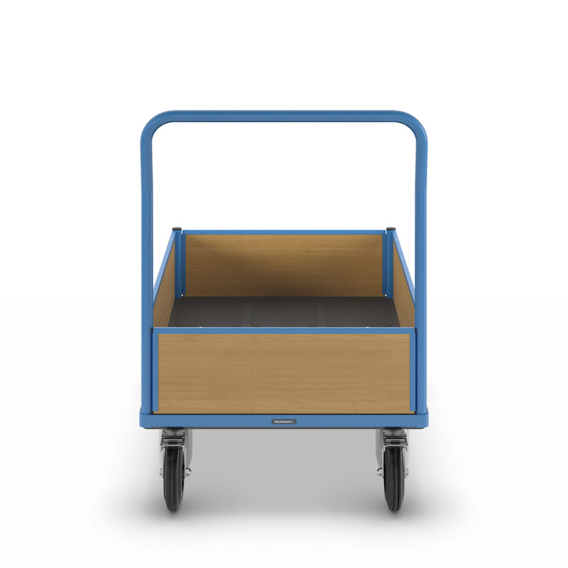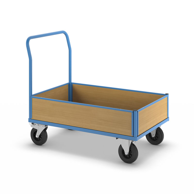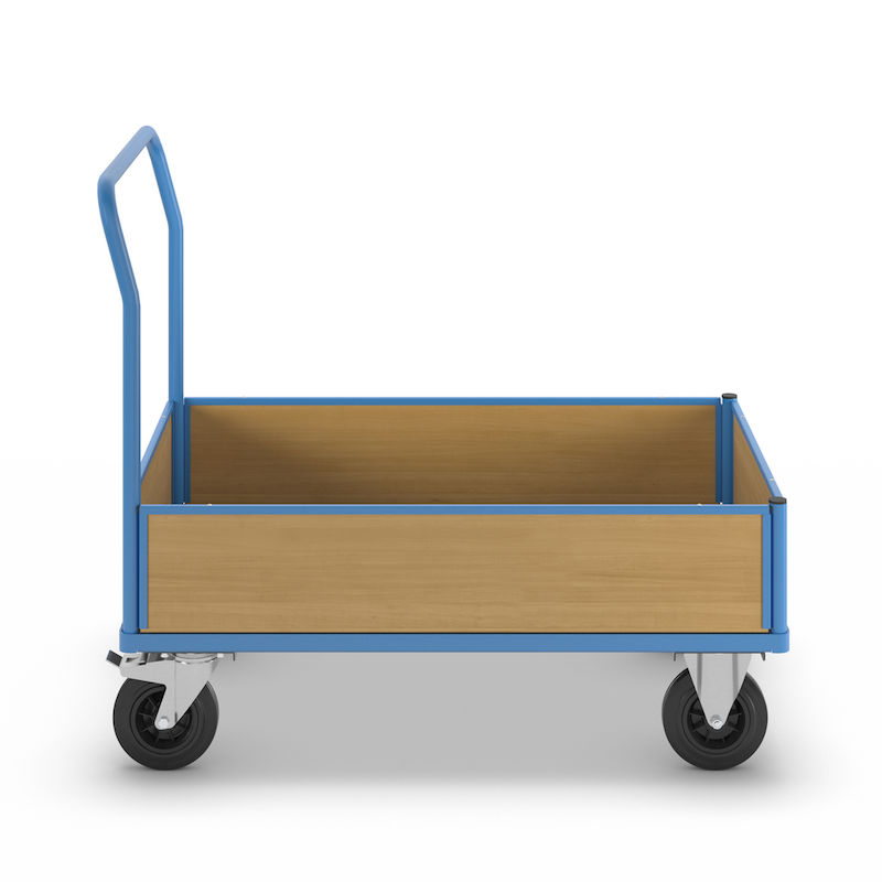 Platformsvogn Line, med 4 halvhøje vægge, LxB 1250 x 800 mm, massive gummihjul. Platformsvognen med trævægge udgør en praktisk og alsidig transportløsning, mens for- og bagpladen virker understøttende for lastsikringen. Den svejsede og pulverlakerede stålkonstruktion sikrer stabiliteten og giver vognen en lang levetid. Individuelt aftagelige sidevægge af MDF, der er belagt med dekormateriale gør vognen fleksibel at bruge. Med en læssehøjde på 280 mm og et robust lastareal af genanvendt plast kan vognen nemt transportere tung last. Lastarealets vejrbestandige, skridhæmmende og slidstærke overflade er ligeledes olie- og i vist omfang syreresistent. Uanset om vognen skal anvendes på lagre, værksteder eller i industrien, så kombinerer den effektivitet, sikkerhed og bæredygtighed og letter den daglige varetransport. Den høje kant hele vejen rundt beskytter godset.