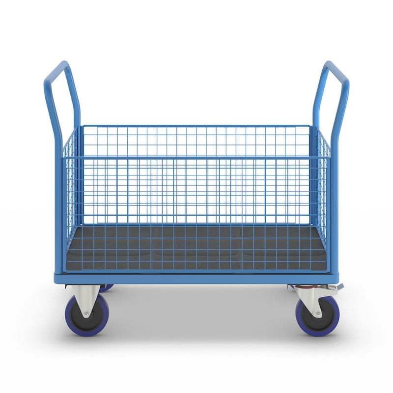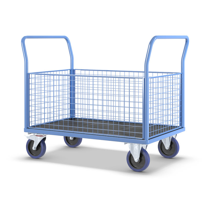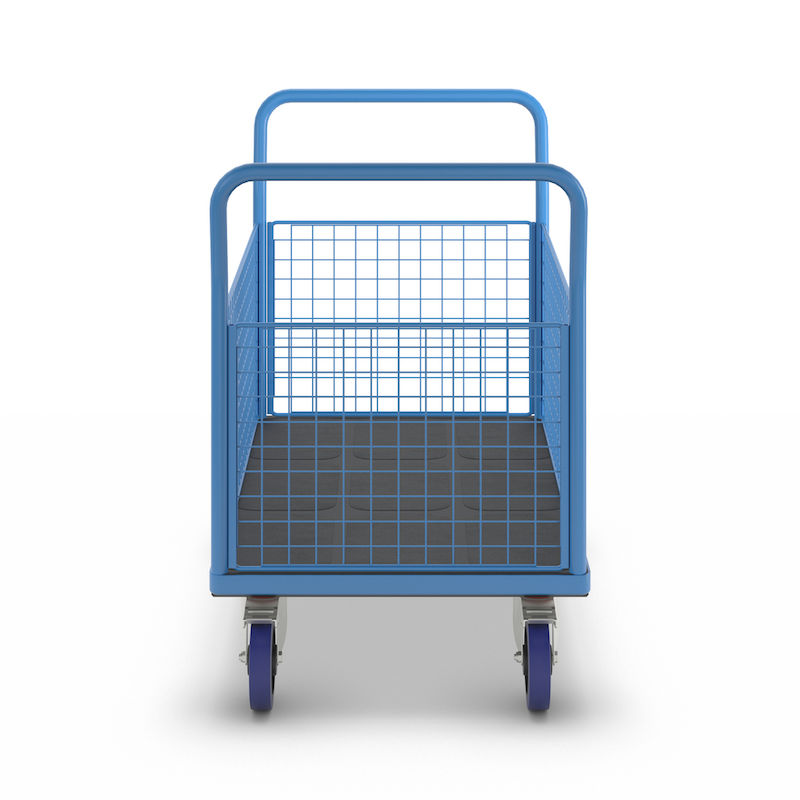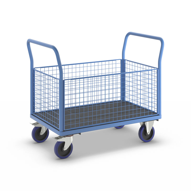 Platformsvogn Malak, fuldelastiske hjul, 4 høje gitre, LxB 1200 x 750 mm. Kvalitetspulverlakeret stel og håndtag. Med en høj frontvæg.