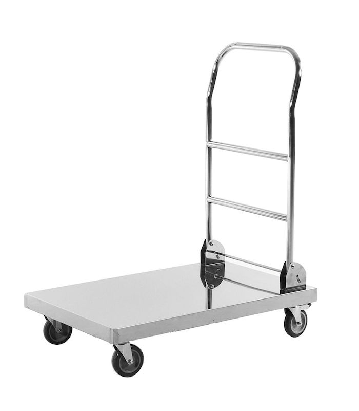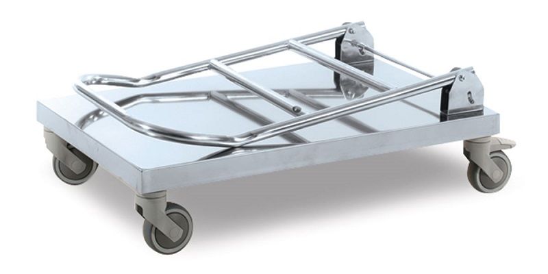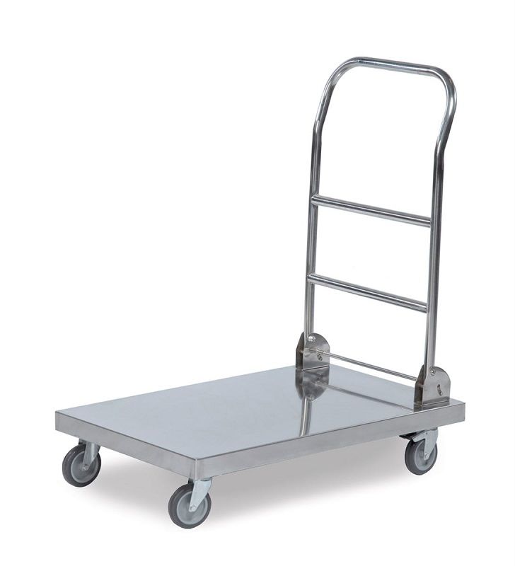 Rustfri platformsvogn, lav, LxBxH 825 x 520 x 970 mm. Stativ og lad af rustfrit stål. Højde til lastplade 470 mm. Lastpladens mål 760 x 440 mm.