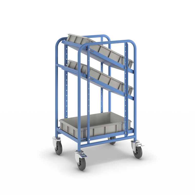 Plukvogn Katja, med 3 kasser, LxBxH 485 x 620 x 1100 mm. Pulverlakeret stålkonstruktion, standard i lyseblå RAL 5012.