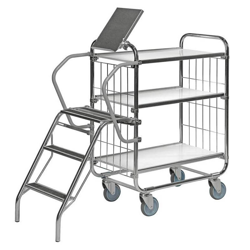 Plukvogn med stige Ven, 815x470x1120 mm, 3 hylder. Ven Plukvogn 2-hylde eller 3-hylde, leveres med automatisk tilbagegående stege. Maxbelastning 250 kg, max 100 kg/hylde. 4 stk drejelige hjul Ø 125 mm. Leveres som standard uden skriveplade. Totalhøjde 1120 mm.