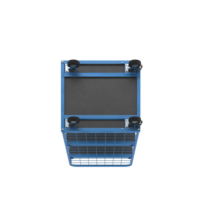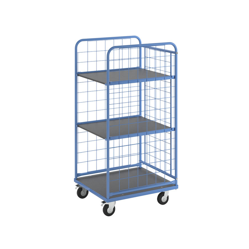 Hyldevogn med gitter på 3 sider Olaus, gitter, 3-sidet, lastareal 750 x 650 mm, med 2 hylder. Pulverlakeret, standard lyseblå RAL 5012. Fastskruet bundplade af MDF-træ, coatet dekor.