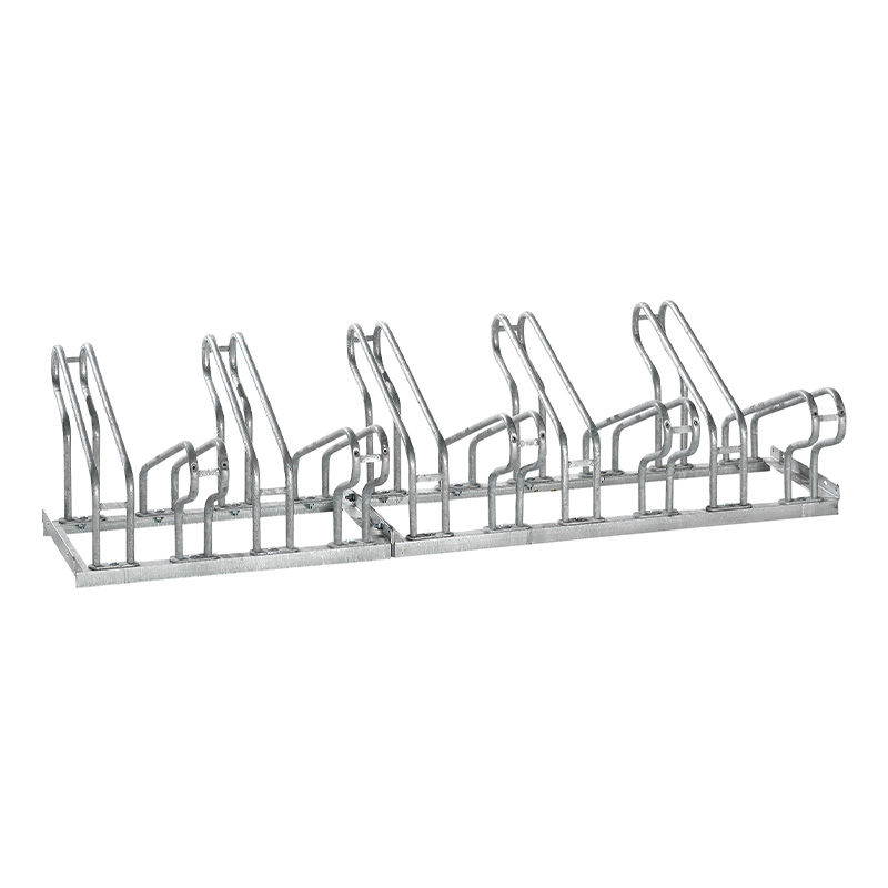 Cykelstativ, 10 cykelpladser, buer i 18 mm stålrør, opstilling af cykler på begge sider, varmgalvaniseret. Pladsbesparende høj/lav-hjulindsætning Forberedt til samling af række og fastgørelse i gulvet. Bred universalbøjle foran til bekvem indkørsel, bliver smallere bagtil med sikker klemmevirkning, så cyklen holdes fast. Indstillingsbøjle af stålrør, Ø 18 mm. Stabil grundramme af 3 mm tykt vinkeljern. Også til mountainbikes med dækbredde op til 55 mm. Gulvfastgørelse til stabilisering og anbefalet som tyverisikring. Fås som tilbehør.