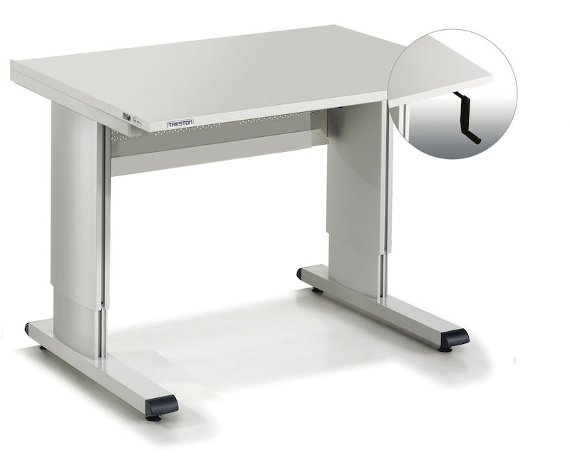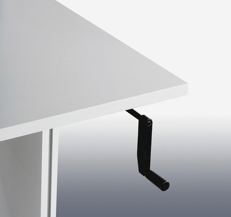 Arbejdsbord Eivind, med håndsving, BxD 1073 x 800 mm. Stabilt stålstel, pulverlakeret i lysegrå RAL 7035. Arbejdsplade, 25 mm tyk, melaminbelægning på begge sider i blændfri knækket hvid (DIN 68765).