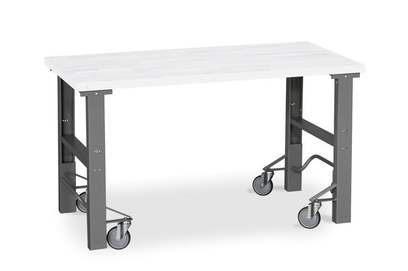 Benbuk på hjul til Arbejdsbord Tor, til 800 mm dyb plade, klarer hele 500 kg. Bordplade købes separat. Tryk hjulene ned for at flytte bukkene og sænk bukkene for at få en stabil og fast arbejdsbænk igen. Løft med fodpedalen. Tor er en serie i arbejdsborde der er velegnet til at klare de hårde belastninger. Mange kombinationsmuligheder med forskellige bordplader, skuffer, tilbehør og overbygninger. Benbukken kan justeres mellem 740 - 1000 mm i højden ekskl. bordplade. Maks. belastning fordelt er på 500 kg. Benbukkene sælges stykvis eller i en færdigpakke inkl. en bordplade. Ved 2500 mm brede borde er der behov for 3 stk. benbukke for at kunne klare en vægt på 500 kg. fordelt.