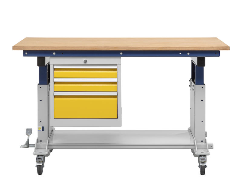 Hæve sænke arbejdsbord med skuffer Rango, multiplexplade i bøg, BxD 1600 x 790 mm. SUPPORTER-arbejdsborde er udviklet specifikt til manuelle arbejdsstationer i produktion og montage. Den store fysiske belastning af medarbejderne i disse områder medfører en stigning i sygefraværet på grund af muskel- og knoglesmerter. Ergonomiske arbejdspladsløsninger tjener sig derfor normalt hurtigt ind – og øger samtidig medarbejdernes tilfredshed og trivsel på arbejdspladsen.