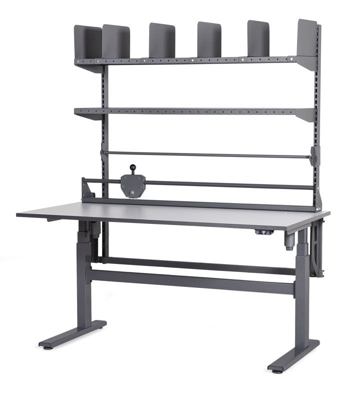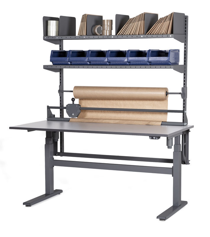 Komplet pakkebord Loke med hæve sænkefunktion til en virkelig god pris! Komplet pakkestation med bordplade og overbygninger som følgende. Pakkebordet har grå HPL-laminatbordplade 24 mm. Overbygning med 2 søjler, 2 hylder c/c 1400 mm inkl. 6 stk opdelingsplader i stål, valse til papirrulle c/c 1400 mm samt skæreaggregat med en skærebredde på maks. 1350 mm. Kap. 200 kg. 1600x800 mm.