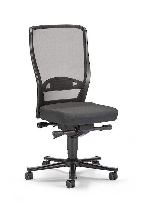 Arbejdsstolen leveres med dobbelthjul med bremse til hårde gulve.