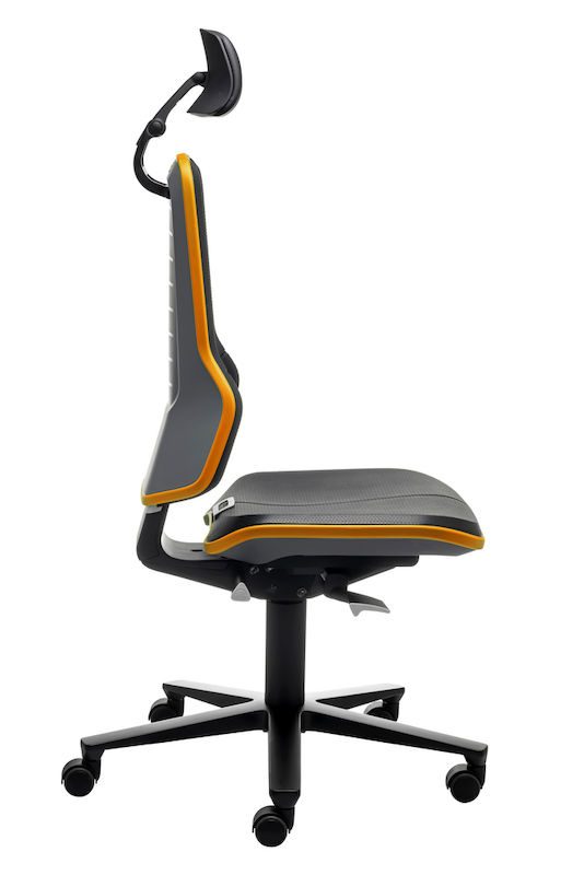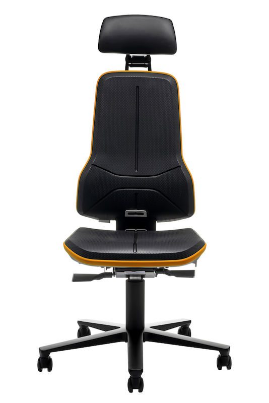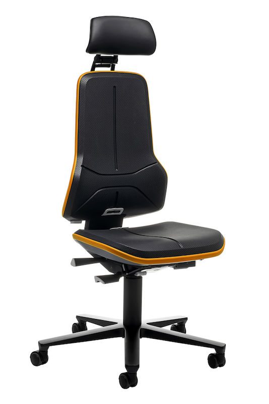 Ergonomiskkontorstol Ela, synkronvippe, PU-skum, orange flexbånd. Denne fleksible arbejdsstol er ideel til skærm, monterings- og kontrolarbejdspladser. Nakkestøtten kan justeres i højden, dybden og hældningen og kan nemt tilpasses, mens man sidder ned. Den er blødt polstret, har et kunstlæderbetræk, kan vaskes af og er nem at rengøre. Takket være den kraftige polstring har stolen en høj siddekomfort, og den ergonomiske rygudformning giver en optimal bevægelsesfrihed. Et flexbånd beskytter stolen og omgivelserne.