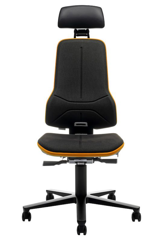 Ergonomiskkontorstol Ela, synkronvippe, stof, orange flexbånd. Denne fleksible arbejdsstol er ideel til skærm, monterings- og kontrolarbejdspladser. Nakkestøtten kan justeres i højden, dybden og hældningen og kan nemt tilpasses, mens man sidder ned. Den er blødt polstret, har et kunstlæderbetræk, kan vaskes af og er nem at rengøre. Takket være den kraftige polstring har stolen en høj siddekomfort, og den ergonomiske rygudformning giver en optimal bevægelsesfrihed. Et flexbånd beskytter stolen og omgivelserne.
