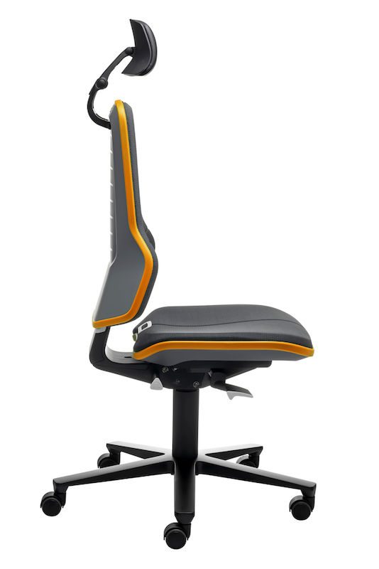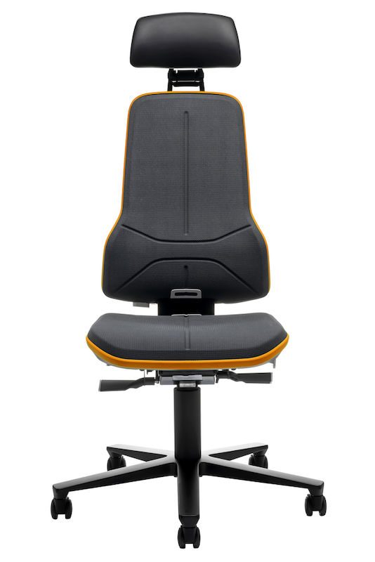 Ergonomiskkontorstol Ela, synkronvippe, Supertec®, orange flexbånd. Denne fleksible arbejdsstol er ideel til skærm, monterings- og kontrolarbejdspladser. Nakkestøtten kan justeres i højden, dybden og hældningen og kan nemt tilpasses, mens man sidder ned. Den er blødt polstret, har et kunstlæderbetræk, kan vaskes af og er nem at rengøre. Takket være den kraftige polstring har stolen en høj siddekomfort, og den ergonomiske rygudformning giver en optimal bevægelsesfrihed. Et flexbånd beskytter stolen og omgivelserne.