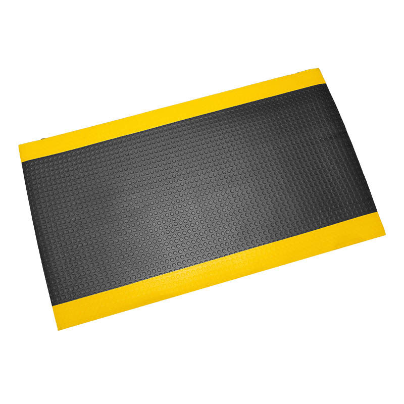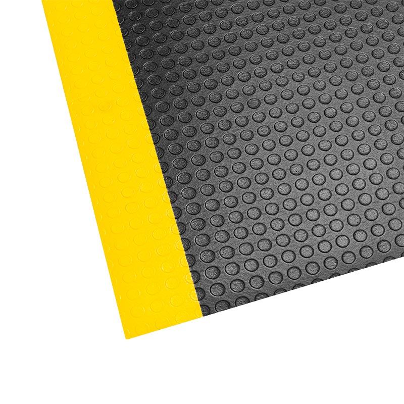 Arbejdsmåtte Senso Coin, B 900 mm, sort, gul kant, pr. løbende meter. Arbejdmåtte Senso Coin er en blød aflastningsmåtte til tørre omgivelser. Den ergonomiske måtte er ekstra tyk, 13 mm og har en behagelig overflade med god skridsikker beskyttelse. Arbejdsmåtten aflaster både ben og ved stående arbejde. Senso Coin isolerer mod kolde betongulve og giver samtidig lidt lyddæmpning. Lavet med en ekstra holdbar mønstret overflad af fuldstøbt vinyl, der forlænger måtten levetid. Let selv at tilpasse med en almindelig måttekniv. Få i sort med tydeligt markerede gule sider. Arbejdsmåtte Coin fås som hel rulle (18.3 meter) eller valgfri længde til en pris pr. løbende meter.