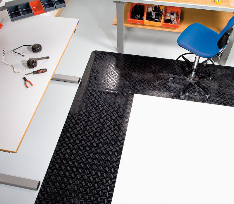 Undersiden af cellegummi og alle kanter er skrå for at minimere risikoen for snubleulykker og gøre det muligt at køre op med en vogn. Måtten tåler visse olier, væsker og stænk, men må ikke stå i væske. Svenskproduceret gulvmåtte i ESD-udførelse. Tykkelse 11 mm.