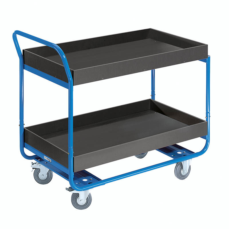 Bordvogn 150 kg kap., 2 hylder med høj kant, kap. 150 kg. Mange anvendelsesmuligheder, f.eks. på lageret, til produktion, montering, forsendelsesafdeling eller arkiv. Bred udførelse Med 75 mm høje sider. Hylder af MDF-plade, coatet dekor. Pulverlakeret stel, standard lyseblå (RAL 5012). 2 drejelige og 2 faste hjul. Alle hjul er med rullelejer. De drejelige hjul er med dobbeltbremse. Af hensyn til din sikkerhed: Standardudførelse med dobbeltbremse iht. EN 1757-3.