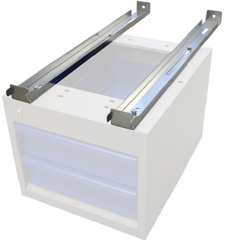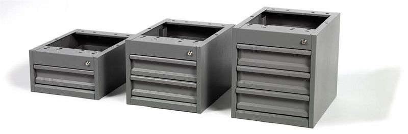 Skuffesektion til Stabil 250 kg, til 600 mm dybde, 1 skuffe. Grålakeret stålplade (RAL 7037). Skuffer med 100 % udtræk. Skuffernes højde er 100 mm. Skufferne kan låses.