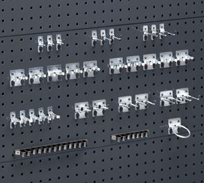 5 enkeltkroge 25 mm dybe, 5 dobbeltkroge 75 mm dybe, 5 værktøjsklemmer Ø 16 mm, 1 fastnøgleholder, 1 skruetrækkerholder, 1 unbrakonøgleholder, 1 borholder.