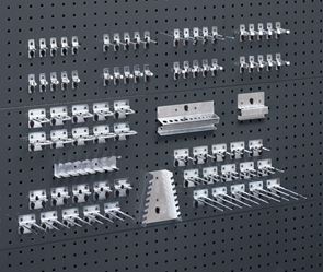 Værktøjsholdersæt Atle, 19 dele, sæt. Galvaniserede stålkroge, Ø 6 mm. Låsning med praktisk plastikclips. Velegnet til paneler med kvadratiske huller 9,2 x 9,2 mm og et hulmønster på 38,1 mm fra hulcenter til hulcenter.