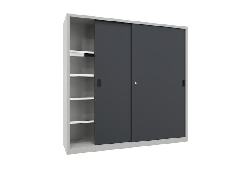Indvendigt udmærker stålskabet med skydedøre sig med højdejusterbare, galvaniserede hylder med en lastkapacitet på 80 kg. De kan tilpasses fleksibelt til forskellige opbevaringsbehov og kan nemt bære tung last. Den galvaniserede overflade øger endvidere resistensen over for korrosion og mekanisk belastning.