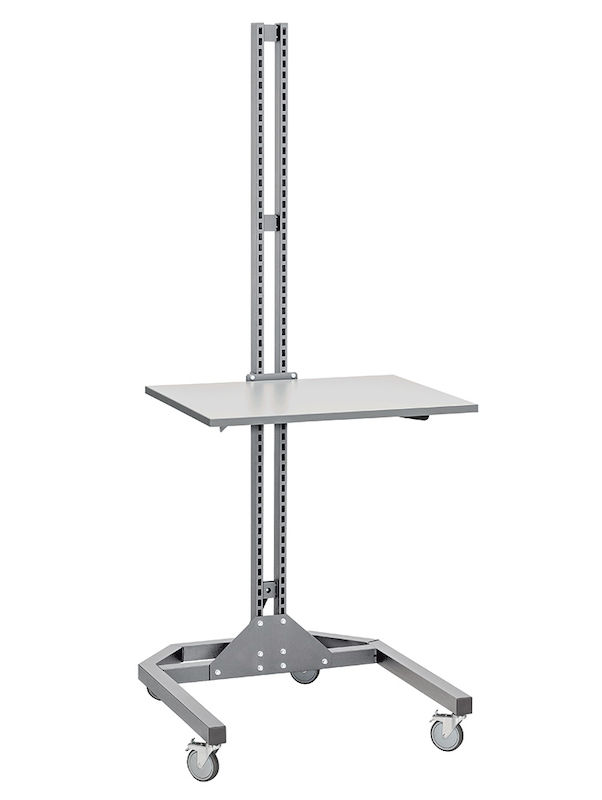 Basisvogn med justerbar arbejdsplade med nem tilpasning til dine arbejdsopgaver. Stel af perforerede søjler, som gør det nemt at tilslutte det tilbehør, der er nødvendigt for at skabe den helt rette vogn til dig. Udstyret med drejelige hjul, heraf to med bremse. Bordplade 800x600 mm. Farve grå RAL 7037.