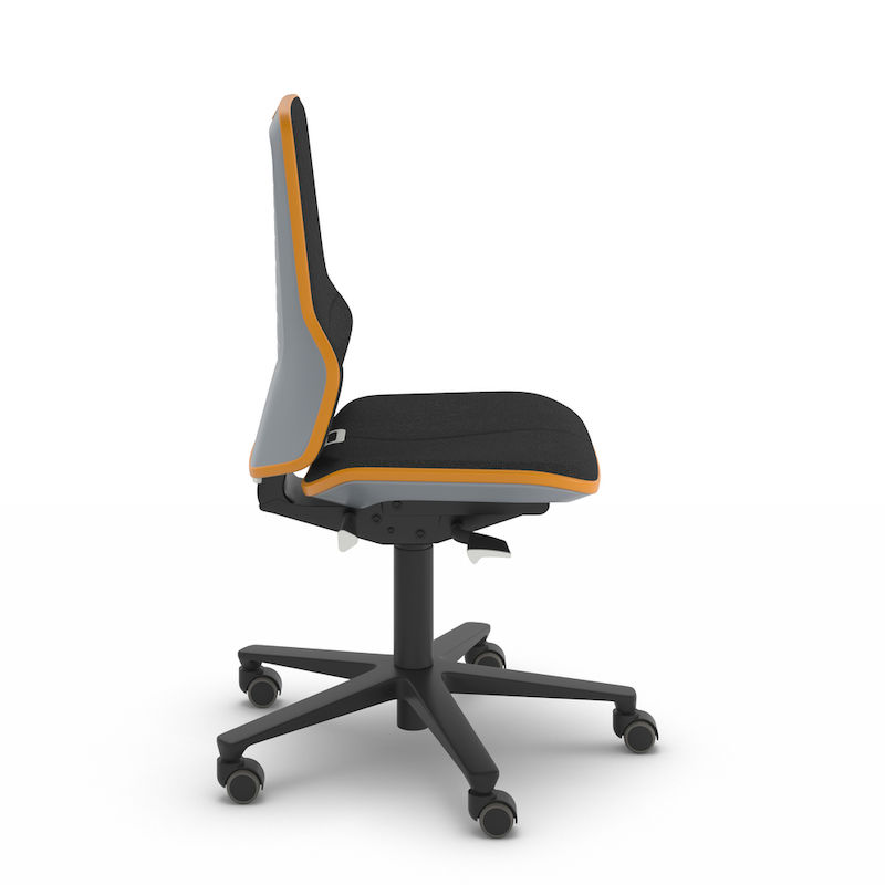 Ergonomisk kontorstol Elif, permanentkontakt, stof, orange flexbånd. Sæde og ryglæn kan betrækkes med stofbetræk, kunstlæder, PU-skum eller Supertec®. Stofpolstringen er åndbar, blød og slidstærk, mens kunstlæderet kan vaskes af og er blødt og nemt at pleje og vedligeholde. PU-skummet kan ligeledes vaskes af, er ekstremt slidstærkt i barske miljøer og er nemt at rengøre. Supertec®-betrækket med knopstruktur er utroligt slidstærkt og resistent over for snit samt nemt at rengøre. Flexbåndet, der fungerer som kantbeskyttelse, fås i farverne grå, grøn og orange.